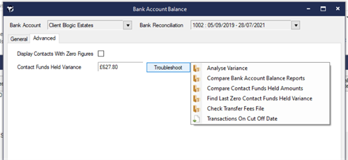 The variance figure can be found on the Advanced tab. The menu options to troubleshoot the variance can be accessed via the Troubleshoot button.