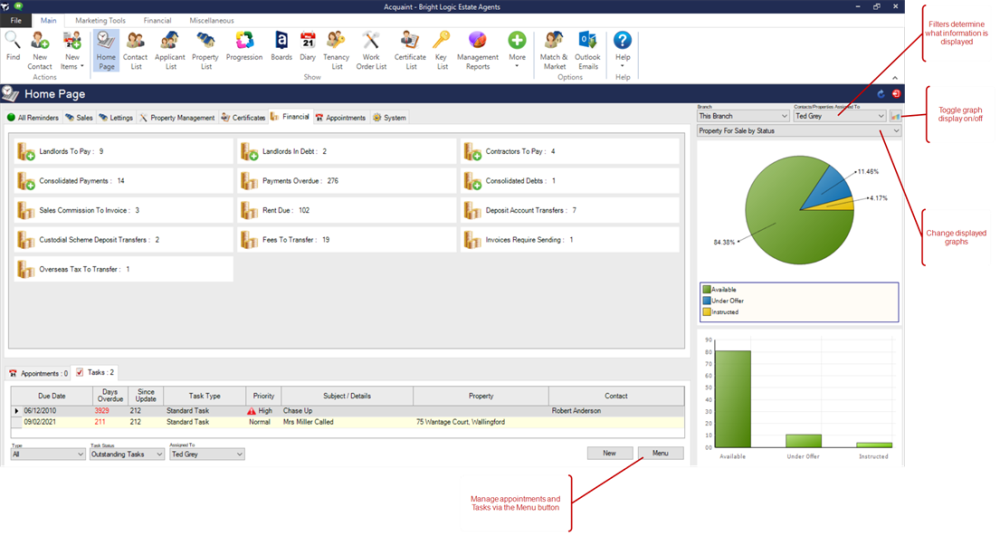 The Home Page provides a central overview of your business activity, including reminders, tasks, and upcoming appointments. By default, the information shown is tailored to the currently logged-in user.