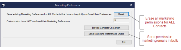 A new screen allows the resetting of existing Contacts Marketing Preferences, and an easy way to bulk send out Marketing Preferences.
