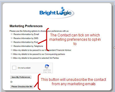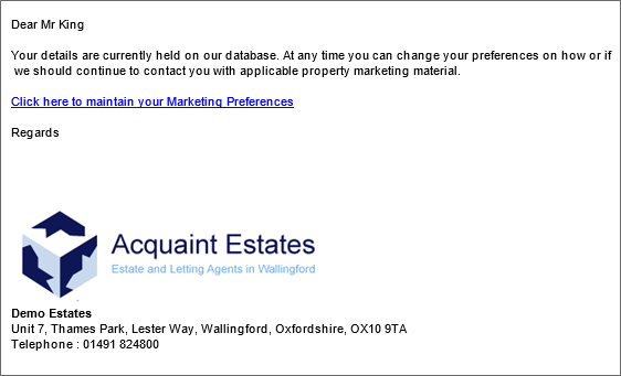 1. Legitimate Interest - As a company you can decide you are satisfied you are compliant using ‘Legitimate Interest’ to send property particulars. If this is the case this can be switched on in your configuration. When you send email particulars from Acquaint using the matching functions this will allow the contact to update their preferences or unsubscribe.