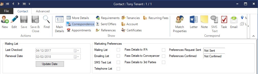 When adding a new Contact the Marketing Preferences options in the Correspondence screen are switched off by default and cannot be manually ticked on unless Verbal (oral) consent is confirmed, however once ticked they can be manually ticked off.
