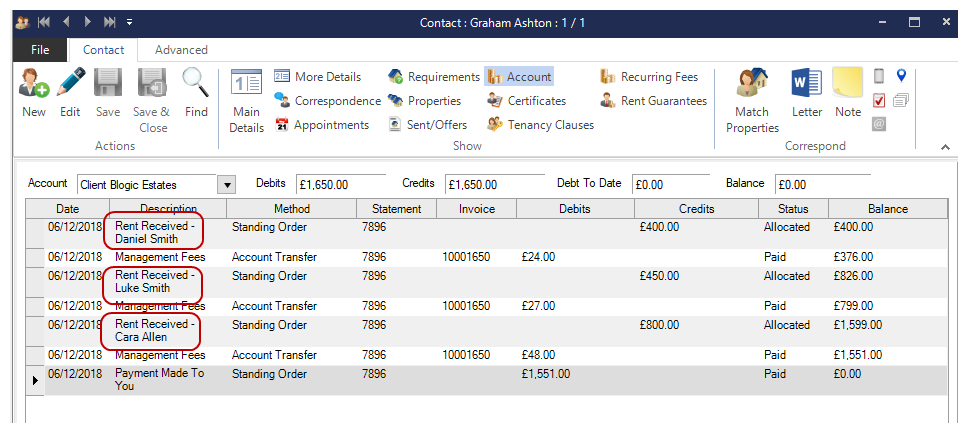 When rent is received against any of the rooms it will appear against the Primary Property record on the Landlord’s account.
