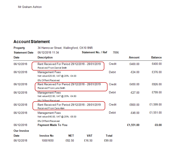 The Landlord's Statements will show the Tenant's name next to each payment.