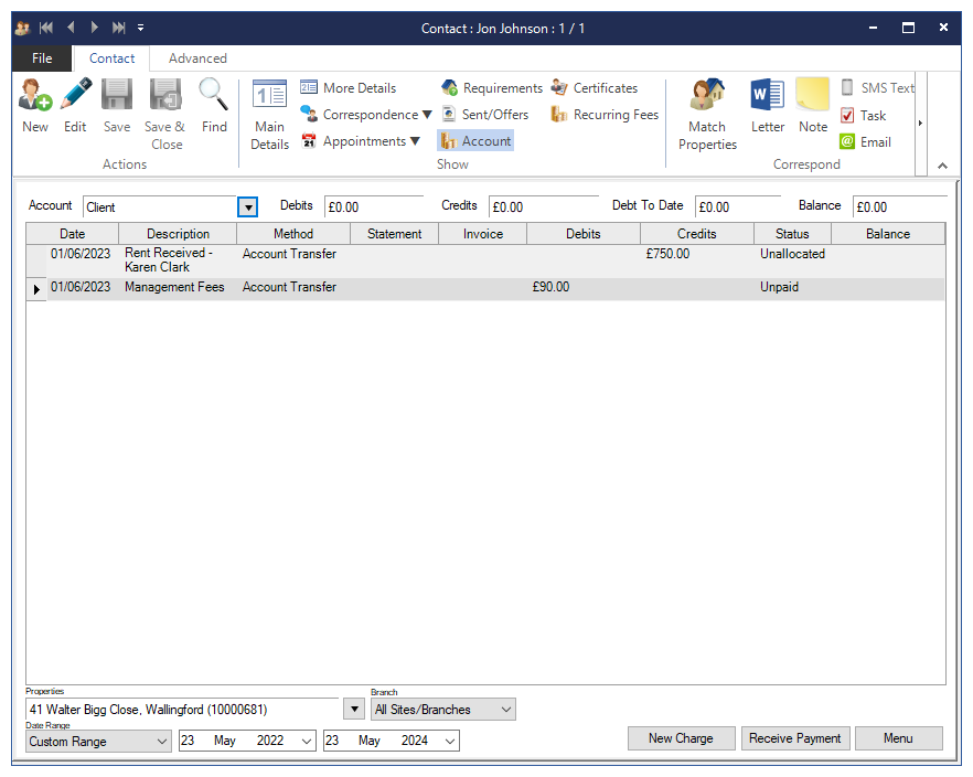 The Account screen for the Landlord shows a Credit of the Rent Received of £750 from the Tenant, and a Debit of the Management Fees of £90 calculated as 10% of Rent plus VAT @ 20%). The Balance of the Account is £615 which is the total now owed to the Landlord.