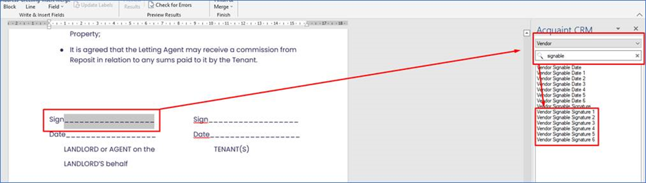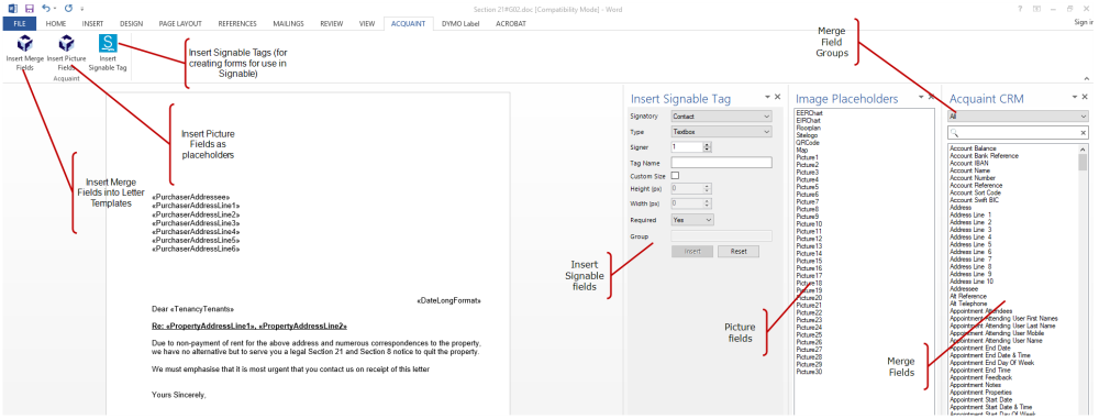 This will open the letter in Word. Here you will see a column on the right, these are all the Tags and Merge fields we use to pull in information from Acquaint and use as Signable tags.