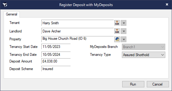 Do not enter any text in the Deposit Scheme ID field against a Tenancy must as will be populated by MyDeposits.