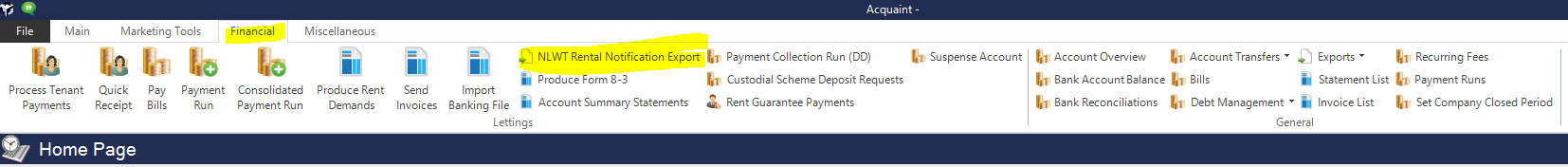 The NLWT form required to be submitted to Revenue can be found on the top Financial tab entitled “NLWT Rental Notification Export”.