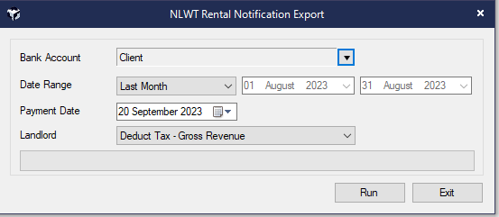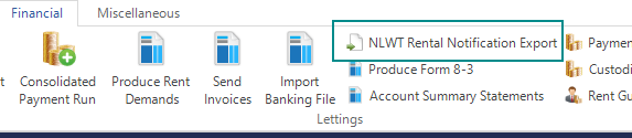 A NLWT Rental Notification Export option is available from the Financial tab.
