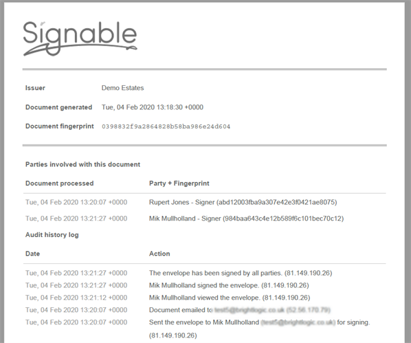 Signable will send a full copy of the document signed by all parties to all recipients for their records. The last page of the completed document will show a full audit history log of the document.