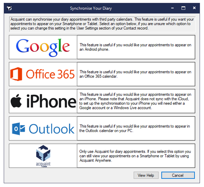 To set-up Diary synchronisation click on the respective link below