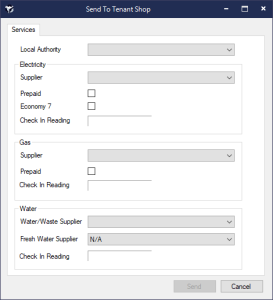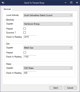 Clicking Yes on the above question will display a Send To Tenant Shop screen, which will allow you to confirm the utility suppliers.