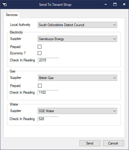 Over time the utility suppliers in Acquaint will get mapped to the utility suppliers in Tenant Shop and the Sent To Tenant Shop screen will automatically get pre-populated with the the suppliers specified in the Property's Services screen. They can be changed as required. Utility readings are not editable on this screen.