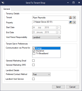 Clicking Yes will display a Send To Tenant Shop screen, which will allow you to enter more information about the Tenancy, Tenant and Landlord; including the Tenant’s opt-in preferences and Landlord void service. The Tenancy will be pre-populated with information