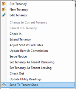 If you don’t send the Tenancy to Tenant Shop during the Tenancy Setup process you can still send it later by right clicking on the Tenancy and selecting the Send to Tenant Shop option.
