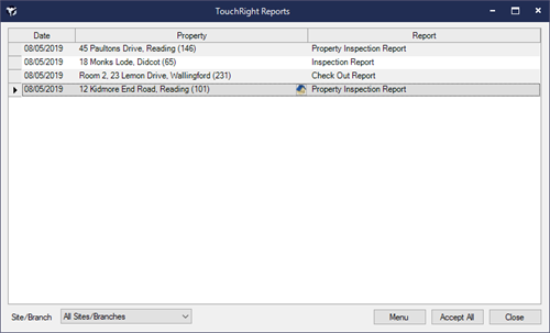 When either the Desktop Alert is clicked the TouchRight Reports screen will be displayed. This will show all downloaded reports that haven't been reviewed yet. Double clicking on a row or clicking on the button in the Report field will load the .PDF report. Clicking the Accept All button will mark all reports in the grid as accepted. The TouchRight report will be stored against the Correspondence screen for the Property.